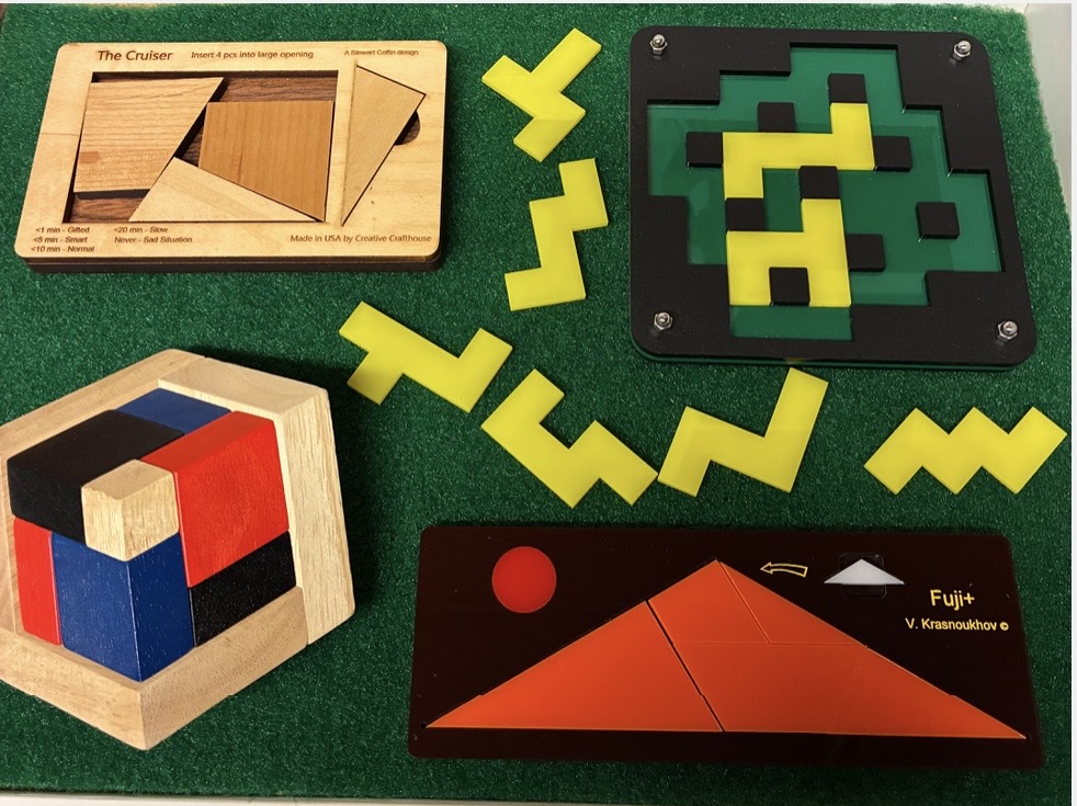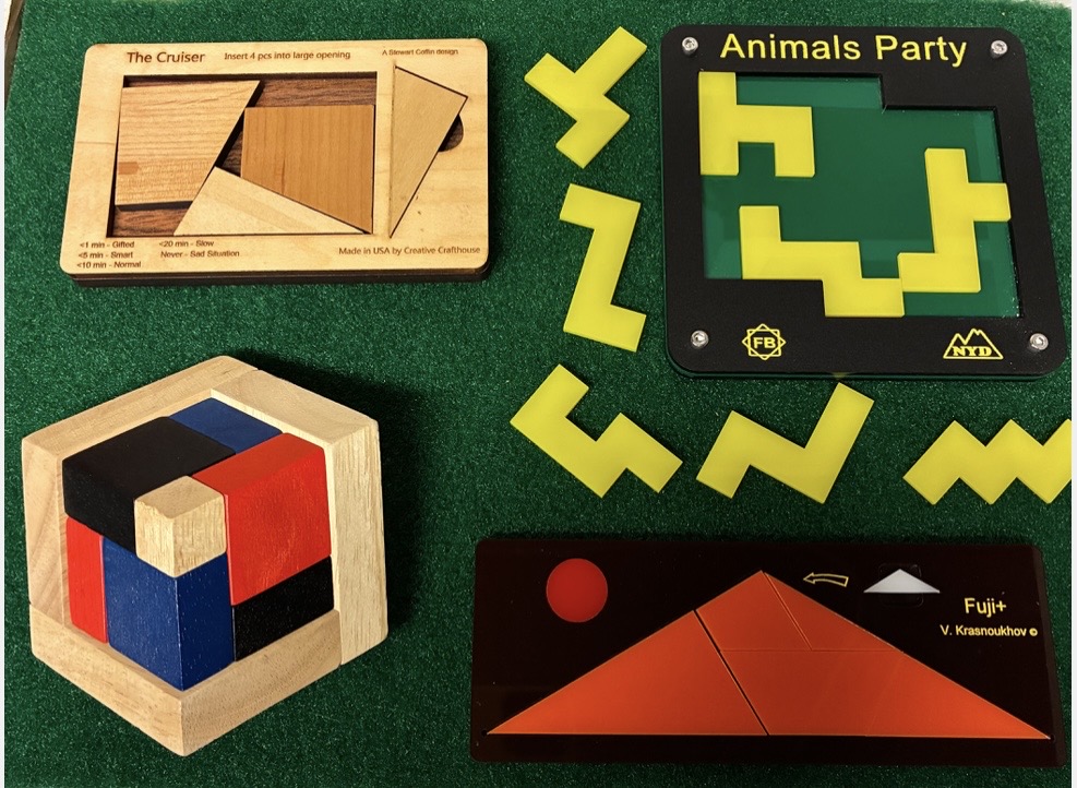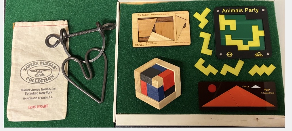 Selling this 1 Lot of 5 puzzles. ~~Fuji. Acrylic packing puzzle by Vladimir Krasnoukhove . Objective, Place the snow cap on top of the mountain with all pieces. This puzzle was designed for IPP39 in Japan. It is sold out and no longer available. ~~Animals Party by Frederic Boucher. Created by Nothing Yet Designs. Acrylic puzzle. 2 challenges. Pack all 8 pieces in tray. Also  on other side pack all 8 pieces in tray. ~~The Cruiser by Stewart Coffin. Wooden packing puzzle made by Creative Crafthouse. Fit all 4 pieces in tray. ~~4D Puzzle. By Windshare Puzzles & Games. Fit the 9 pieces in the base. This puzzle is a geometrical challenge. ~~Iron Heart. Tucker Jones Tavern Puzzle. Steel Puzzle forged by blacksmith. Object, remove the heart and put back on. Comes with original storage bag. All puzzles in excellent condition. Selling the whole Lot only. Shipping in U.S.A. Only. Buyer pays for shipping.  Please wait to send payment until shipping cost is determined.