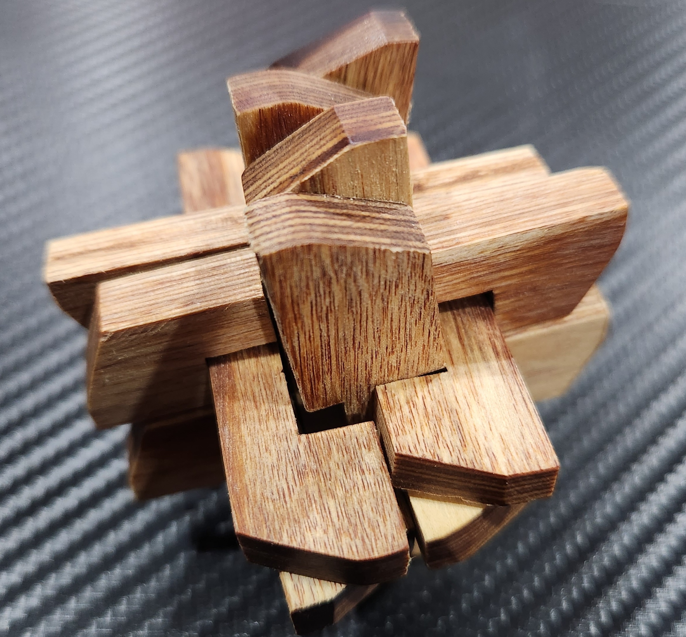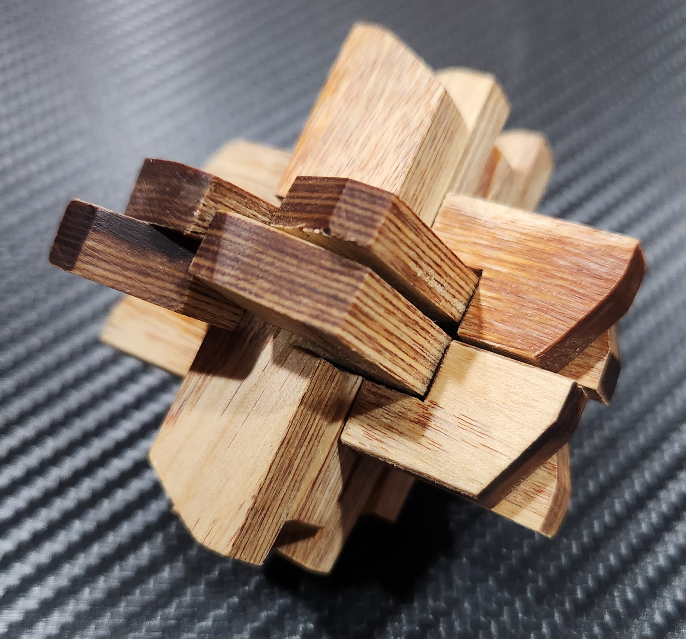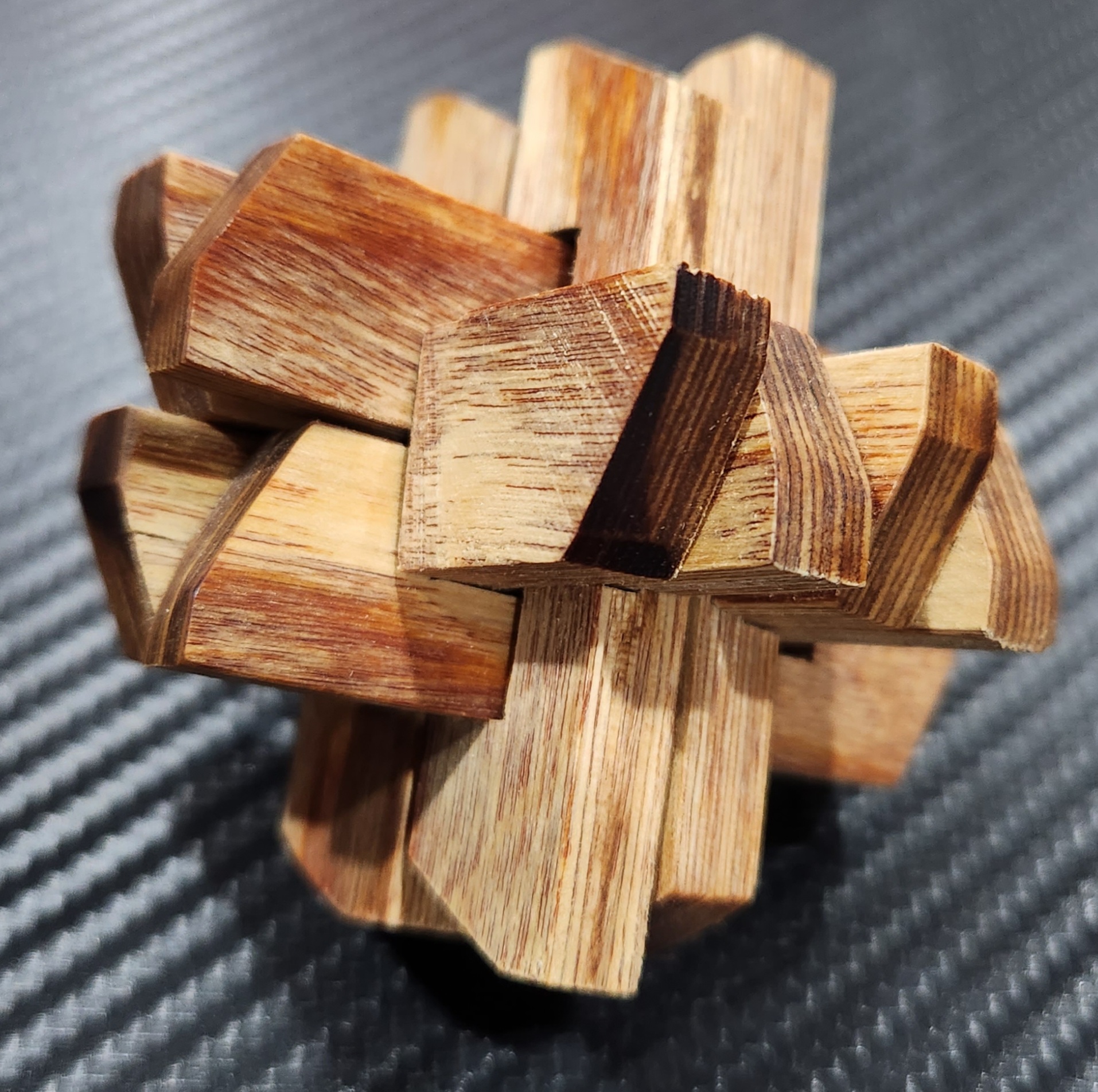 When you first pick it up it feels loose in the hand like it may fall apart... but it never does... the pieces are assuredly locked in place and the more you roll it around in your hand the better it feels. With non-symetrical pieces and angles... it scratches that part of the brain that is wild yet controlled.