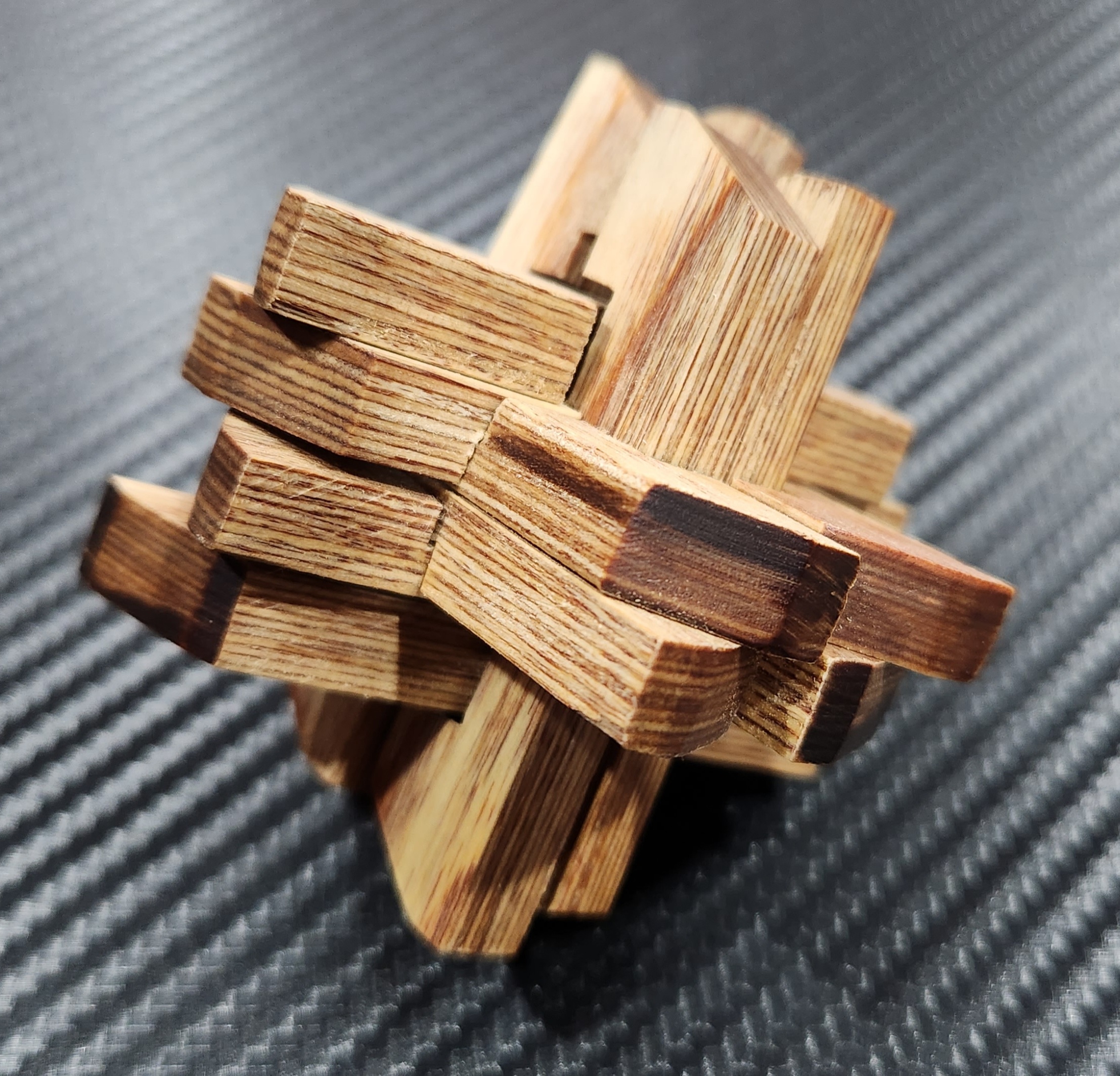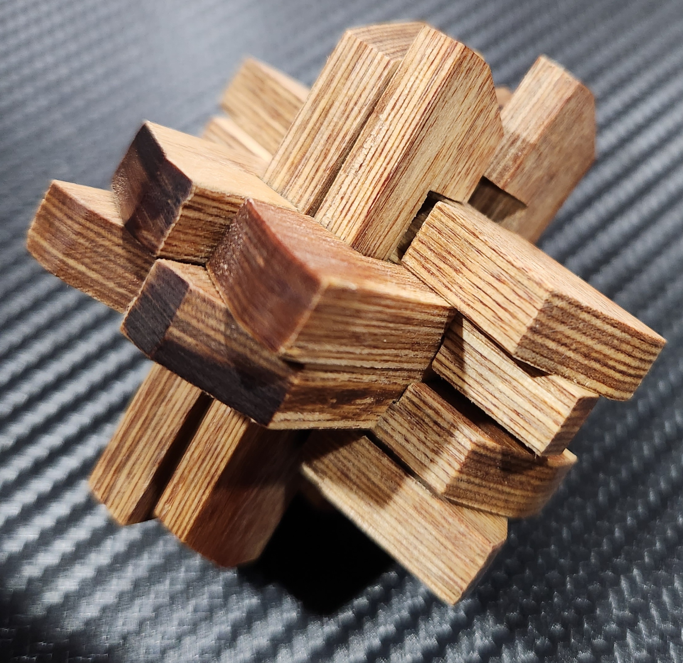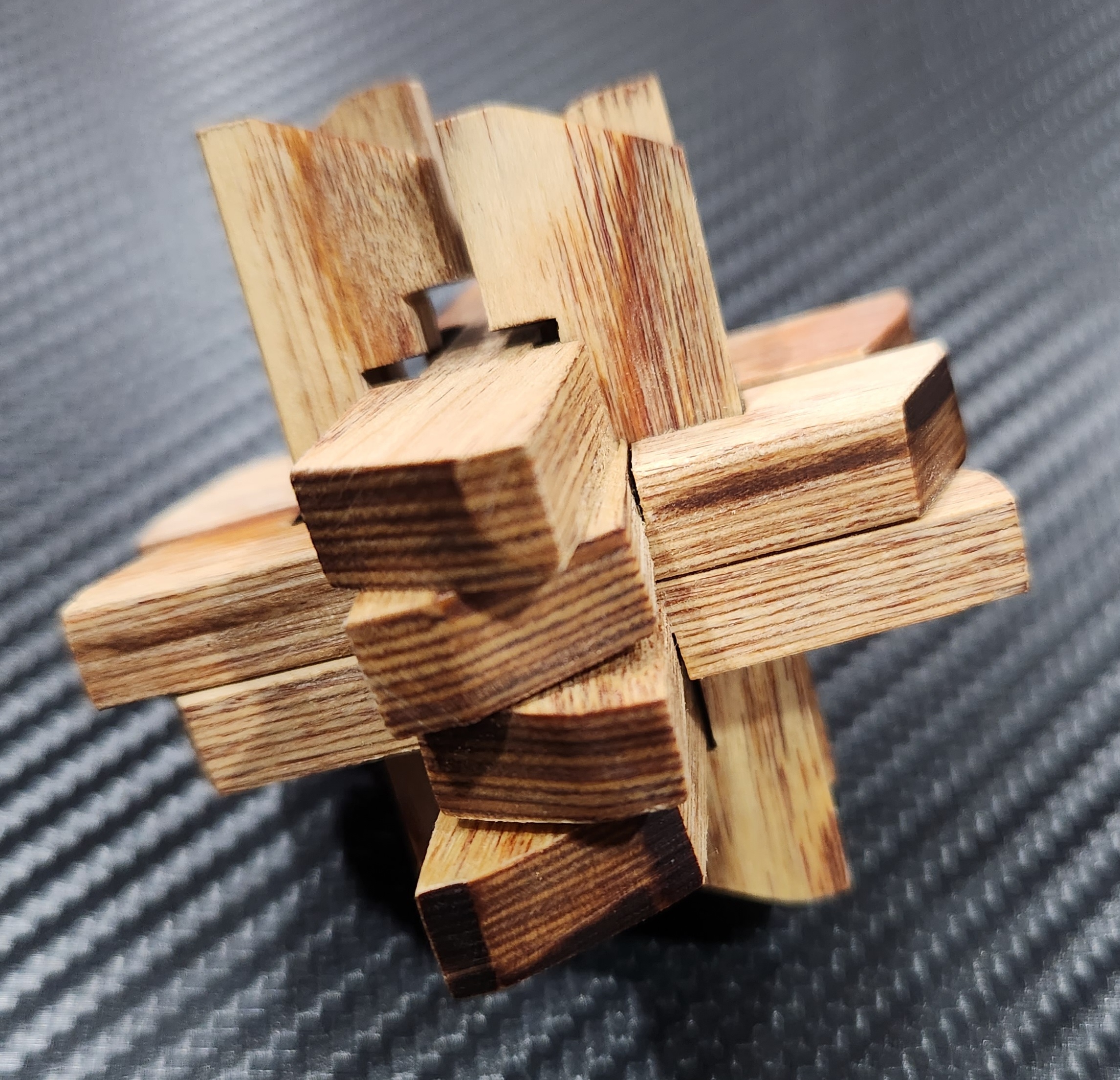 When you first pick it up it feels loose in the hand like it may fall apart... but it never does... the pieces are assuredly locked in place and the more you roll it around in your hand the better it feels. With non-symetrical pieces and angles... it scratches that part of the brain that is wild yet controlled.
