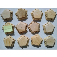 Pieces: Twelve.  The five edges of each piece has either two holes, one hole and one peg, or two pegs.