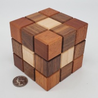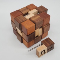 • description: A monumental cube built from Walnut, Mahogany, and Maple, 205 Minutes is a masterclass in puzzle durability and complexity. Originating from Leontev’s 4‑ary cube dissection, the original version required a staggering 12,282 moves, approximately 205 minutes at one move per second while a refined edition reduced this to 8,190 moves, all housed within a precision-crafted resettable mechanism of just 38 pieces and 30+ steel pins.