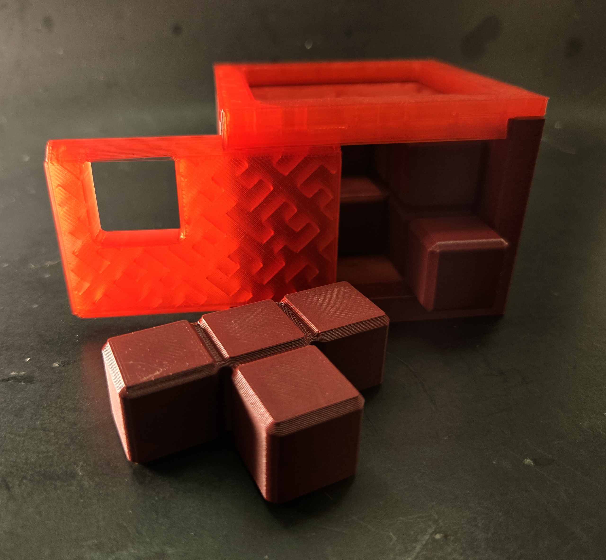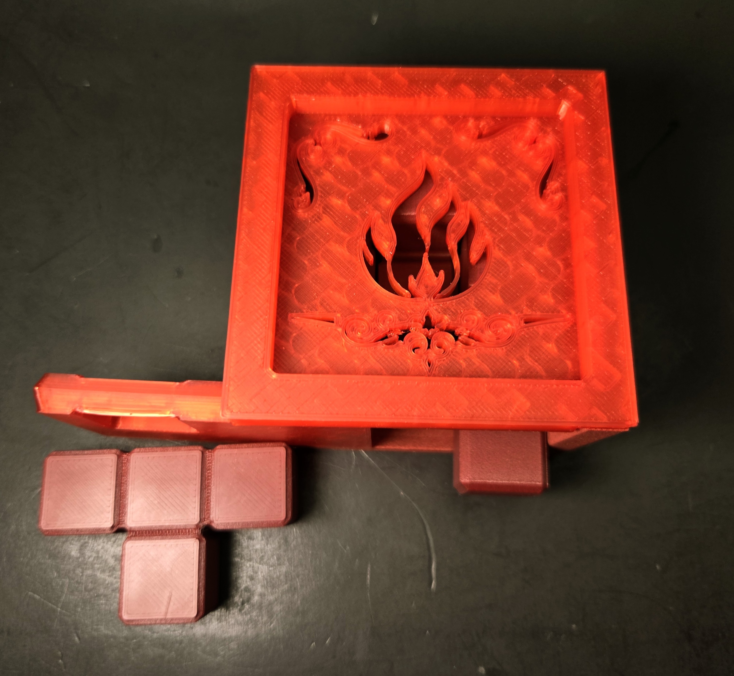 Made with the last of my cherry carbon fiber, with burgundy carbon fiber pieces, and red translucent framing, lid, and door.