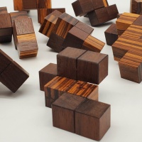 • description: designed by Rob Stegmann in 2003 and crafted here by Scott T. Peterson, this interlocking puzzle consists of eight pieces that assemble into a perfect 4×4×4 cube. Each piece is made from two n-tetrominoes, forming four color-matched pairs; Peterson’s Bocote version highlights the puzzle’s core theme of duality through the use of contrasting exotic woods and distinct face patterns that reflect the geometric symmetry of the design.