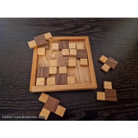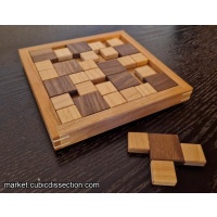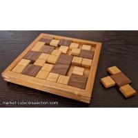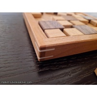 A simple tray packing puzzle. Did I say simple? Sorry to mislead you. Ten pieces, made up of a 3x3 unit square and a varying number of 2x2 unit squares, pack into one large square. This is the first puzzle I have made in a while that only uses domestic woods. I knew these were going to take a long time to make so I was trying to keep the material costs low. Each puzzle is made from at least 4 of the following woods, Cherry, Ash, Walnut, Alder, Beech, Maple and Holly. The frames are both shouldered and splined with Holly.