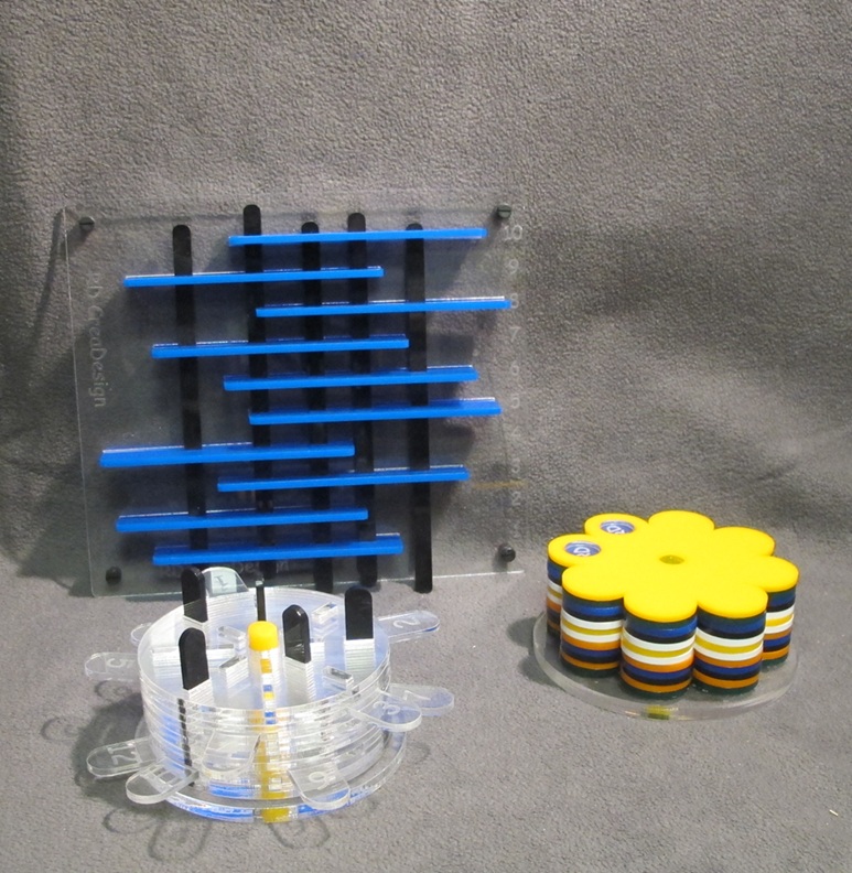 This is a beautiful made puzzle by Brian Menold. There are three cubes which stacked on each other will provide 13 visible surfaces. The challenge is to arrange the cubes in such a way that there’s one continuous line across all these 13 surfaces. The way Brian made the cubes must have been very time consuming! Every line is a solid piece of wood surrounded by the lighter wood. With the lacquer finish it looks stunning! As for the puzzle...it’s pretty hard!Shipping to be determined aft...