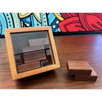 Absolutely stunning craftsmanship with tons of layered exotic woods used to create the box. This puzzle has been signed by the Brian Menold on one of the Z pieces as well as on the back of the box itself.  It also includes both of the makers marks for Brian Menold & Haym Hirsch on the backside of the box.
