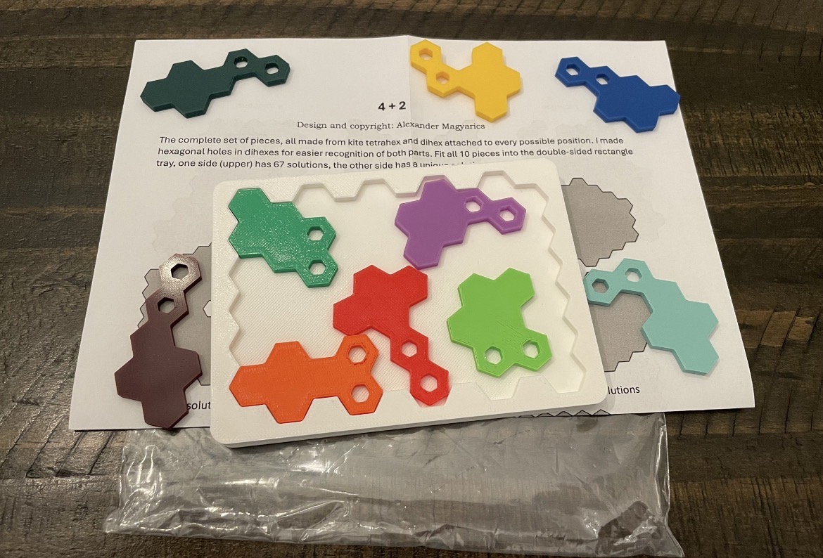 Goal: Pack all the pieces into the double sided tray. One side has 67 solutions and the other has only 1 solution. Also has other challenges.