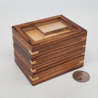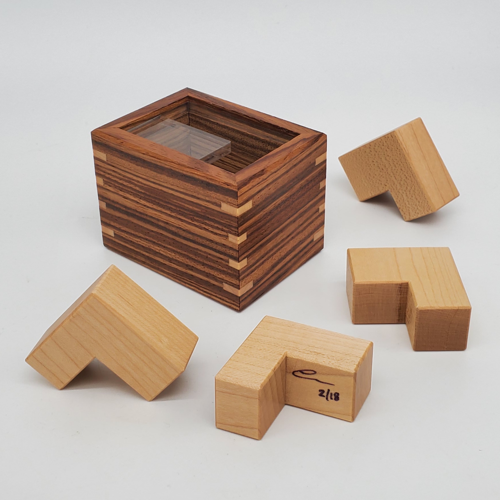 Outline Burrdesigned by Karin Von Kanelcrafted by Eric Fullermeterials: Maple, Walnut, Zebrawoodcondition: great fit, no flawsdescription: a six-piece burr puzzle featuring three identical and three mirrored pieces, it offers a Level 7.4 solution enforced by the wood types. The entire puzzle is built with half-lap joints to ensure durability and aesthetic appeal. I spent weeks trying to get the pieces together and had maybe the biggest AHA moment when I got it. It's a large puzzle compared to re...