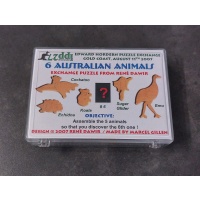 A very fun puzzle! The goal is to assemble the 5 animals (Echidna, Cockatoo, Koala, Sugar Gilder, Emu) so that you discover the 6th one. The pieces must be placed on a flat surface and must not be turned upside down. I am not the original owner but the puzzle is no more used than I received it. Excellent condition but I want to point out two details that the previous owner didn't show to me: small stains on the koala's back and a tiny piece missing on the Echidna (see photos). I solved the puzzle once, it comes with original box and I can provide the solution upon request.