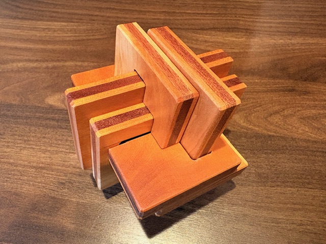 Medium difficulty, 6-piece board burr. 15 steps to remove the first piece, and 14 steps to remove the second. Stays surprisingly stable for the most of the solve. See more details at https://shop.pluredro.com/collections/archive/products/6-board-burr-5x8-02-2c.