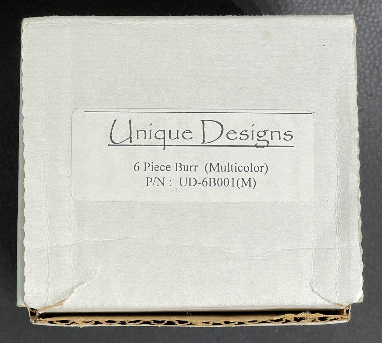 This beefy all-metal burr weighs in at 1 lb, 4 oz.  It's 3"x3"x3".