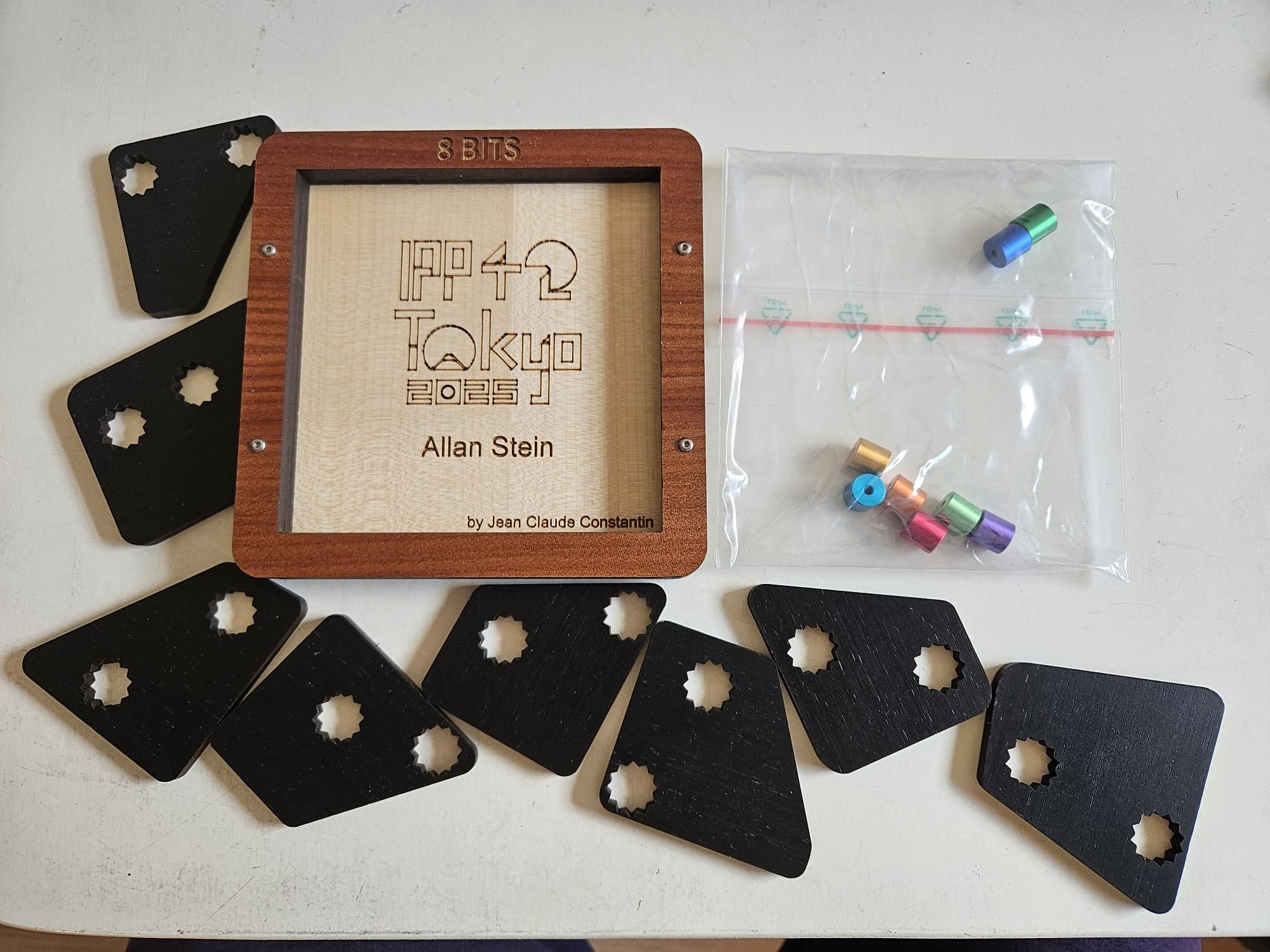Up for auction is a packing puzzle called 8 BITS desigend by Jean Claude Constantin and exchanged by Allan Stein at IPP Tokyo 2025. The goal is to put all 8 pieces in 2 layers into the given tray so that the colorful pulleys will fit the holes of the pieces throughout the 2 layers - a challenging but superb brain teaser The item is in great condition.
