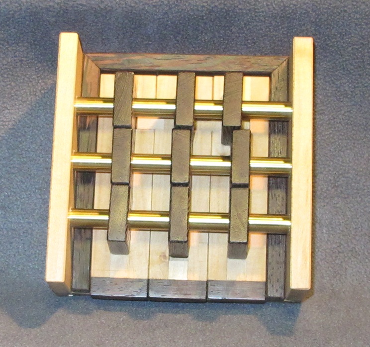 the object is to remove the sliders held in place by the pieces on the brass rods.