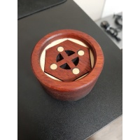 This is a really gorgeous puzzle crafted from Bloodwood and Ebony with a 24k gold plated medallion on top. The goal is to remove the Lincoln wheat penny. It's a clever puzzle that is also fun to fidget with! I believe less than 10 of these special editions were made. It is in mint condition and has been kept in a humidity controlled, smoke free, and pet free home.