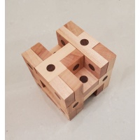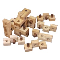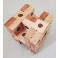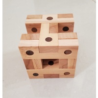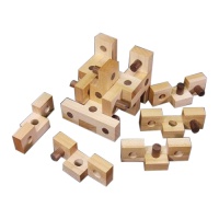 There are 14 pieces to the puzzle, all different. The pieces have a total of 21 holes drilled in them in various formats and a matching 21 rods glued into the 14 pieces.