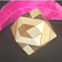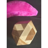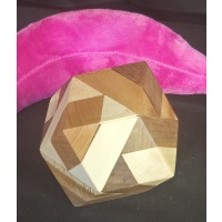 This stunning and intricate wooden puzzle was handmade by Allen Rolfs in 2004. Crafted with multiple types of wood, the puzzle features a complex geometric design with varying shades and grain patterns, making it a beautiful display piece as well as a challenging brain teaser. The craftsmanship is exceptional, with tight-fitting pieces and a smooth, polished finish.