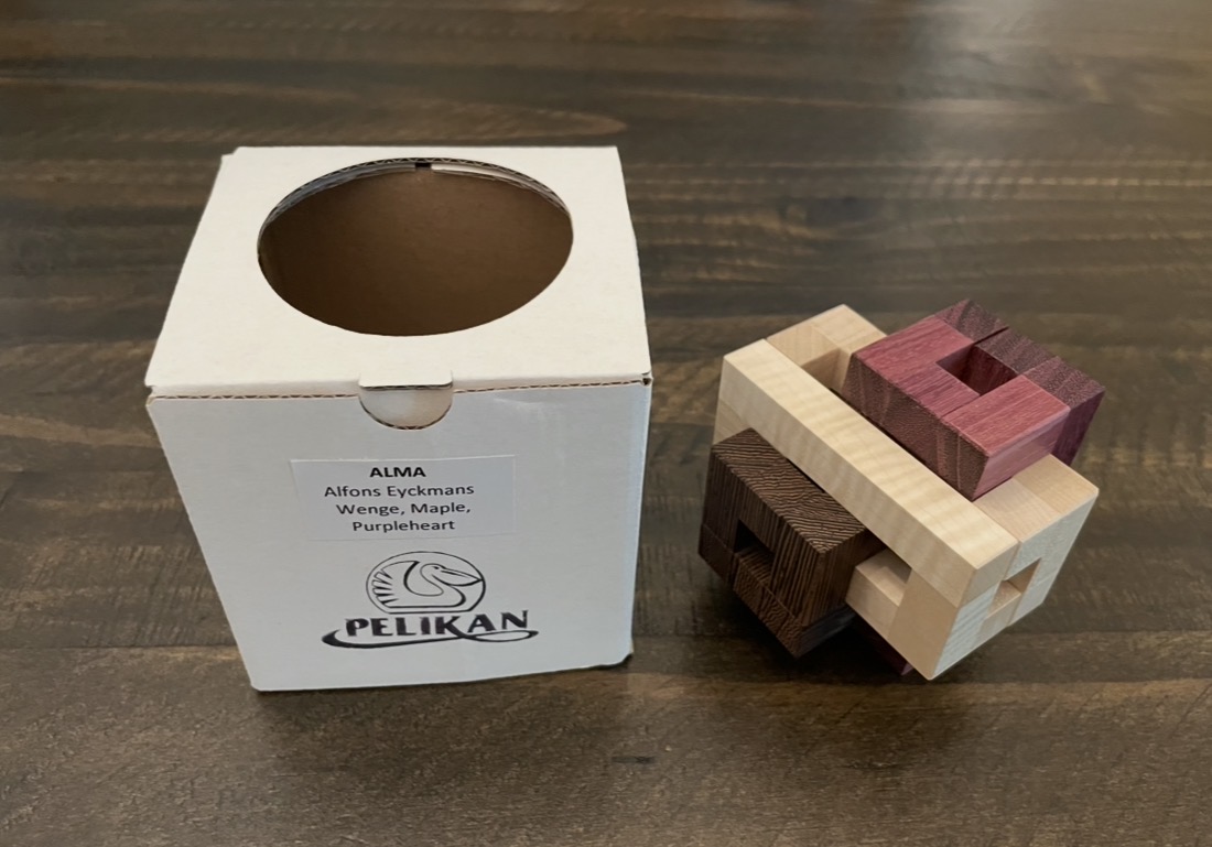 Designed by Alexander Magyarics and crafted by Pelikan.Goal: Pack the pieces into the restricted opening with a movable section of the box.Woods are Mahogany and Wenge(Works like an elevator and Very Challenging!)Perfect Condition. Comes from a smoke free home and properly stored.Will package with a collector in mind for shipping.*Buyer pays shipping costs and will be added at end of auction. I accept Friends and Family and Goods and Services payments. I understand the importance of G&S with buy...
