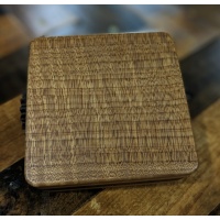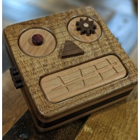 Angry Walter's reign of terror must end. His devious plots to dominate and destroy my household is tiresome and although he has apologized on multiple occasions the wife says he is beyond redemption and cannot be trusted and therefor must go. Maybe someone else can rehabilitate him. Good luck to you. Size is 5x5.5x3 and made from quarter sawn roasted curly maple with very unusual grain pattern, padauk, cherry and Peruvian walnut.