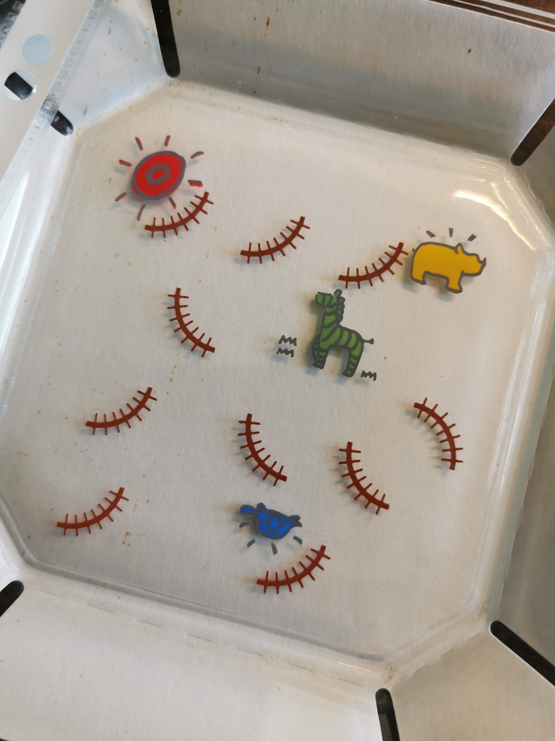 Stack the four glass plates one on top of each other so that when seen from above it makes one continues fence around the animals.