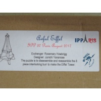 From the set of IPP37 exchange puzzles this is "Awful Eiffel", exchanged by Rosemary Howbrigg.Designed by Junichi Yananose and manufactured by Mr Puzzle.A transparent Eiffel tower burrThe puzzle is packed in a box measuring 17x7x7 cm.