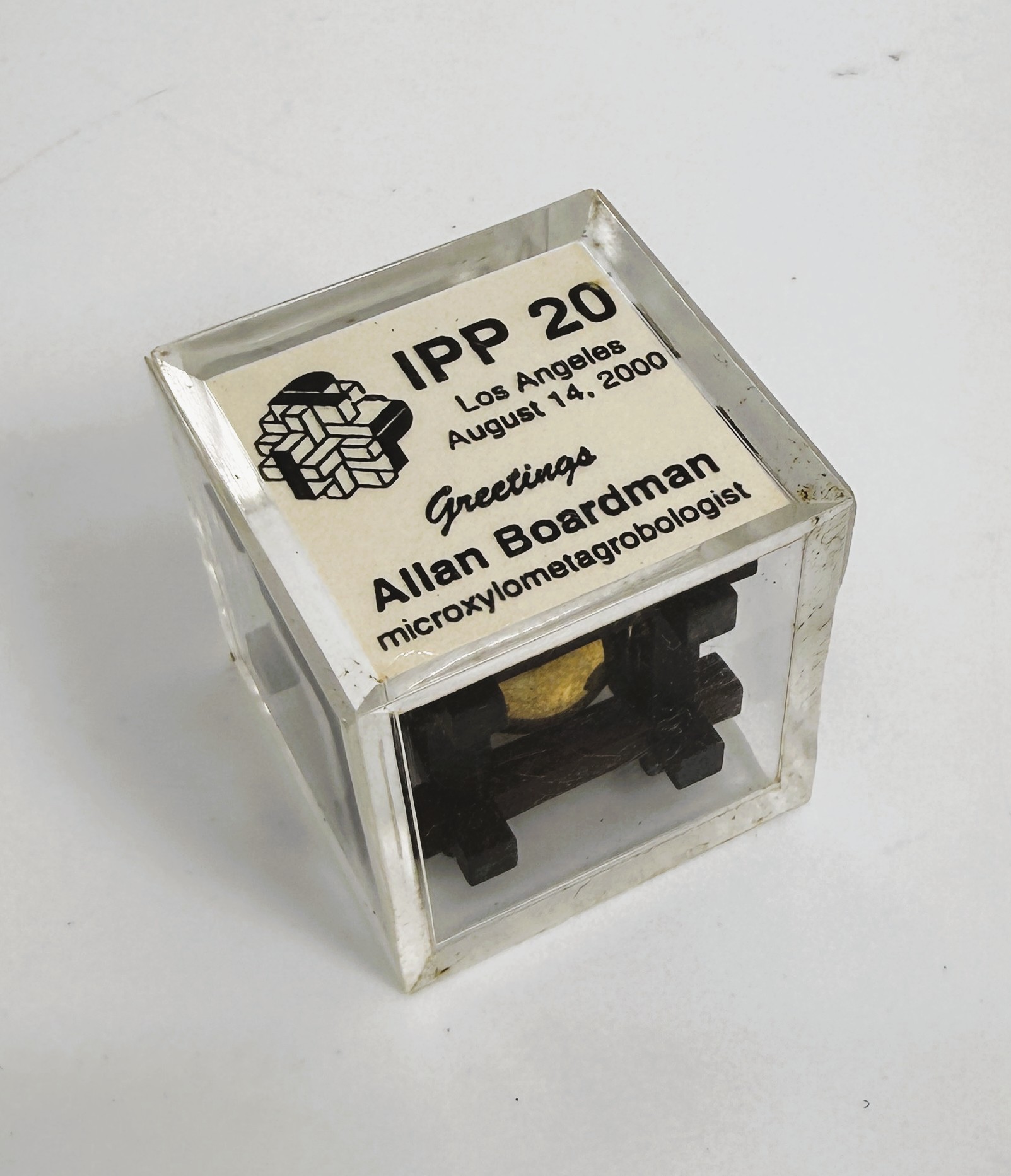 An original miniature burr puzzle made by Allan Boardman to exchange at IPP20 in LA in 2000. Allan is a master of making not just miniature but micro puzzles. He said at the time he didn’t expect many people to actually play with the puzzle but that if you wanted to you could. The puzzle is fully functional and made with very fine tolerances.