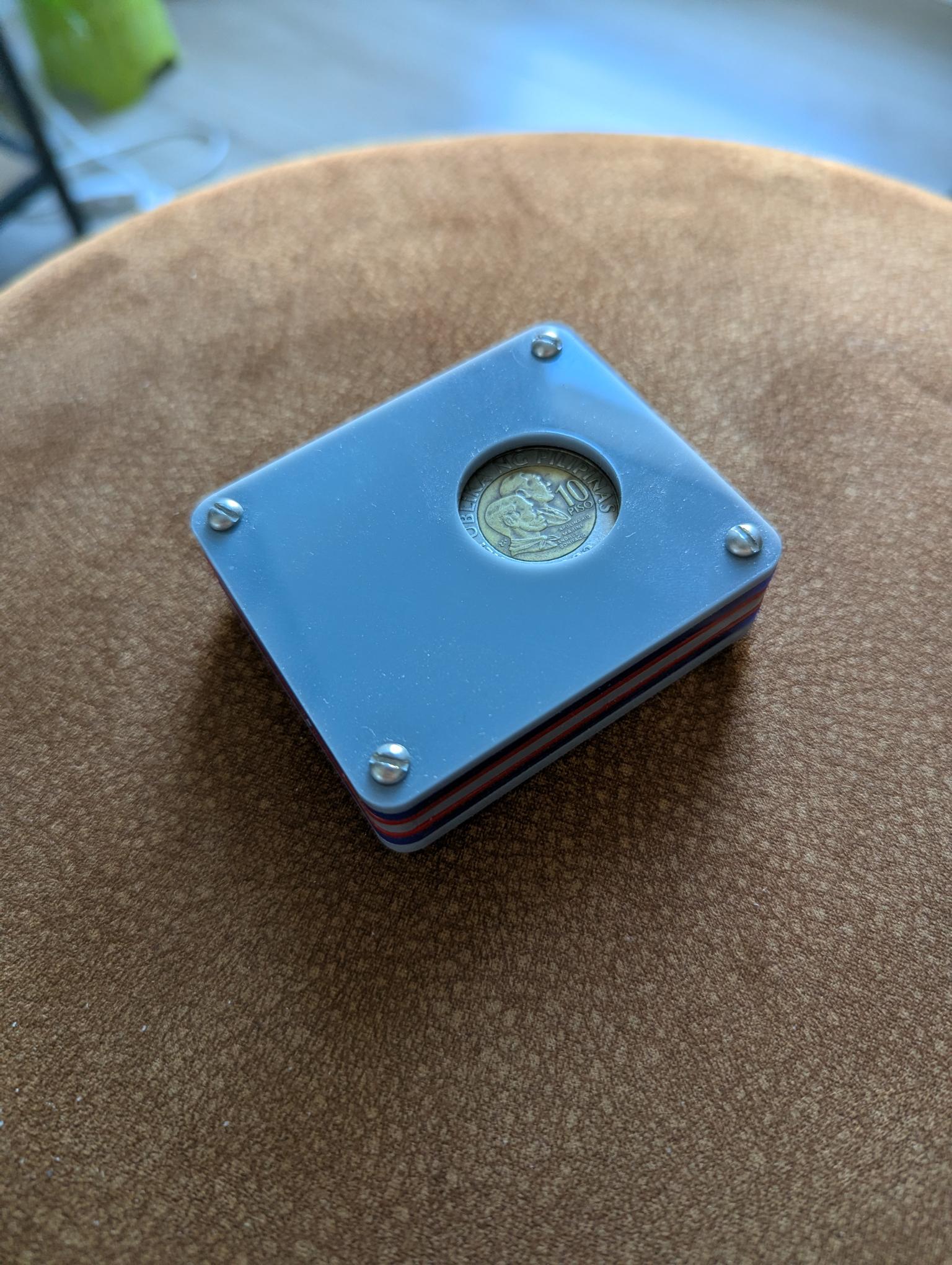 Barasoain is a beautiful laser cut acrylic pocket size puzzle by Rex Rossano Perez with a simple goal: to free the coin. Barasoain is a challenging, ingenious sequential discovery puzzle that sits at 7 cm on the longest side.