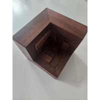 The construction of this puzzle is robust. Internal pieces are beveled on all faces, as is the outside of the box. The box itself has angled splines made from the same rosewood as the pieces to keep the joints from moving or splitting down the road.