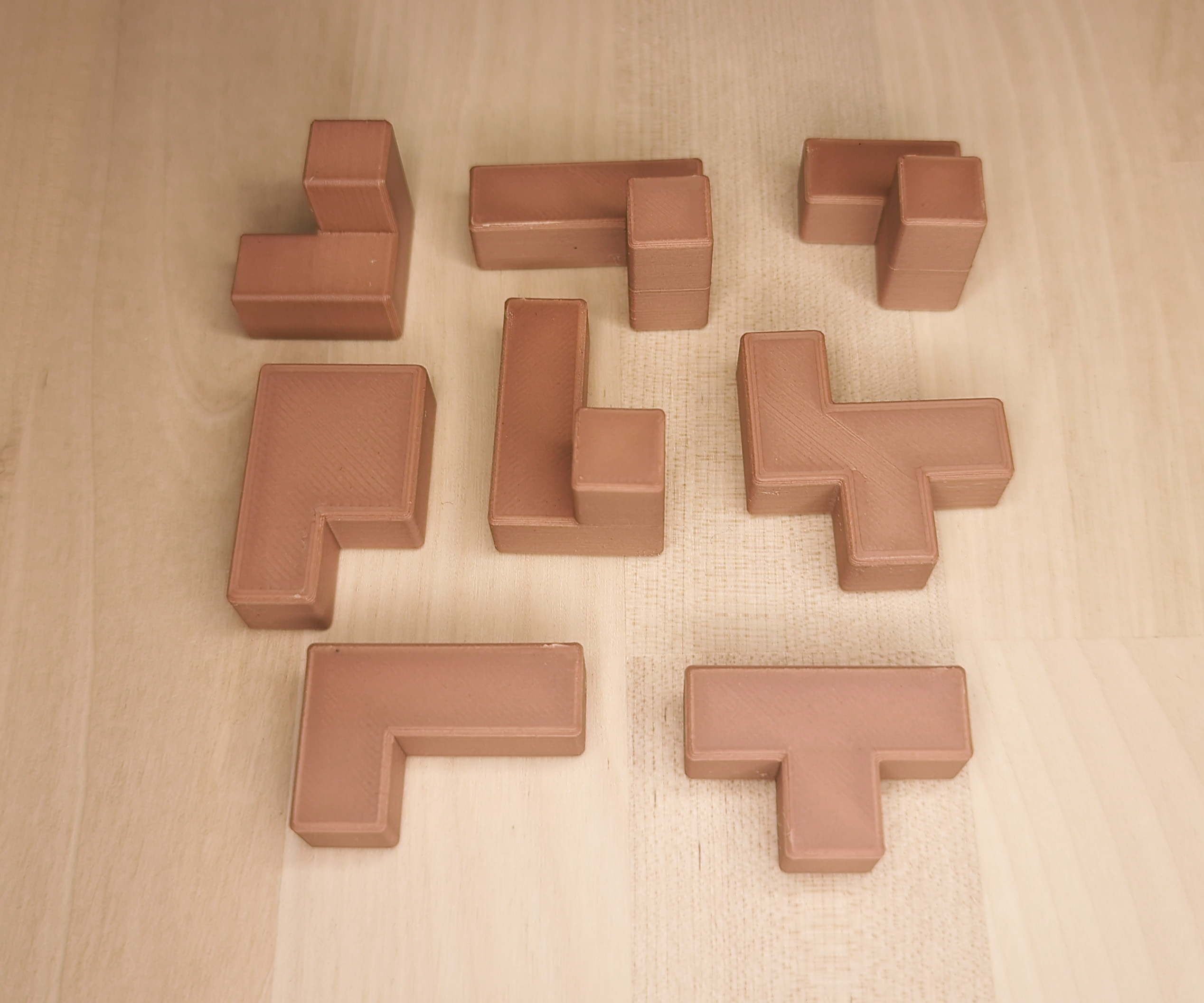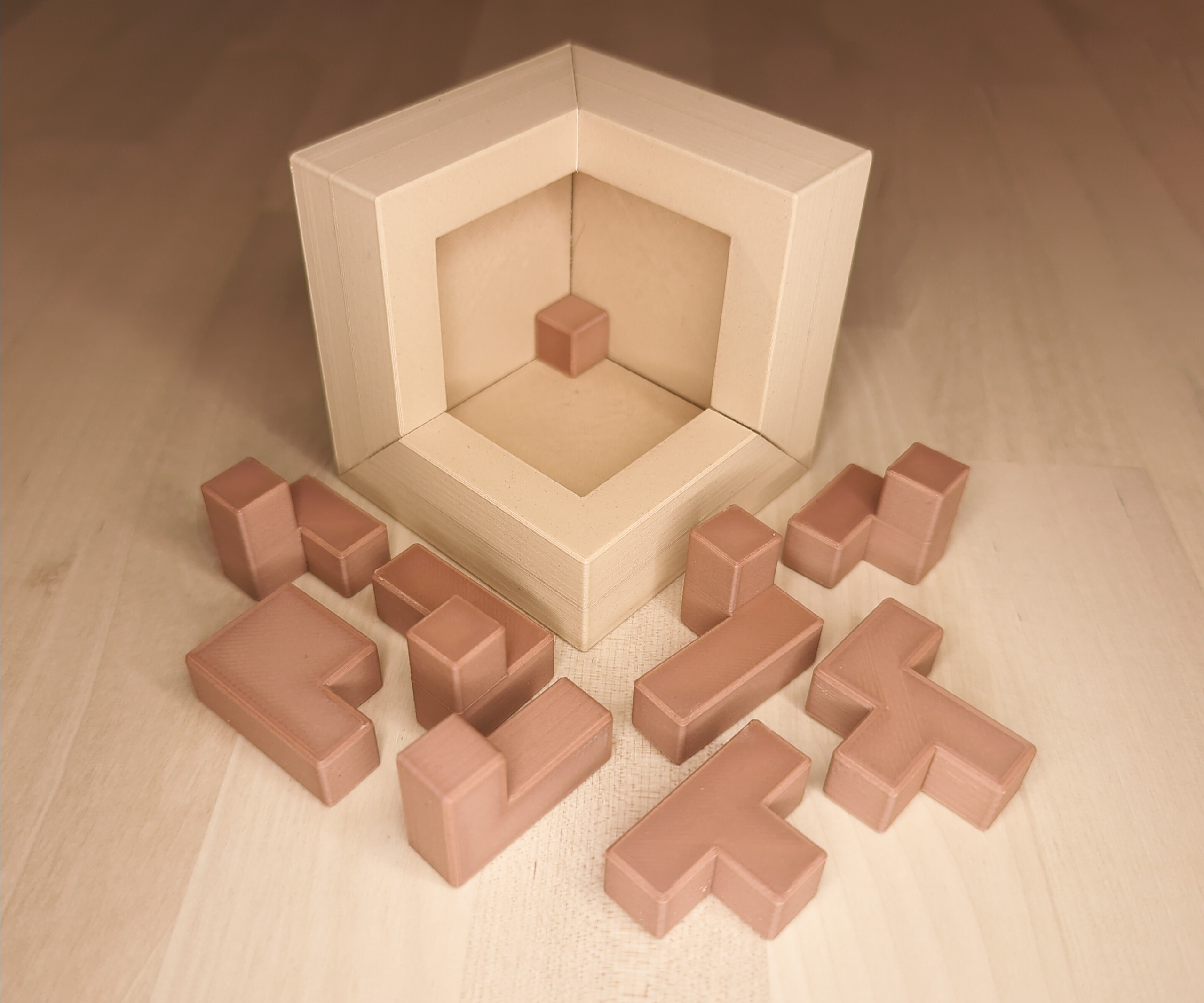 It all began in 1978. Dean Hoffman designed his Packing Puzzle, a cube made up of 27 identical pieces. But it was different from the usual; it was imperfect, because its volume was smaller than that of the box it was contained in. Despite its six completely parallel faces, it contained empty spaces. This cube had 21 valid solutions.The brilliant Haym Hirsh drew inspiration from this cube. He began by designing the Hoffman Jr. puzzle (Inelegant 5x5) and continued the series with Inelegant Soma, I...