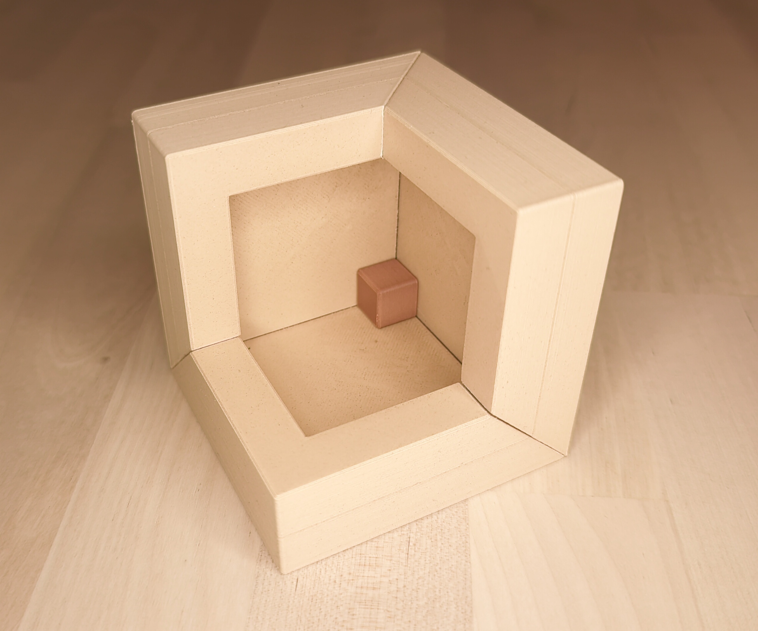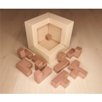 First of all, the container is open at one corner and therefore incomplete, and the pieces will "paper" the inside walls, rather than forming the usual cube we often see in other packing puzzles.