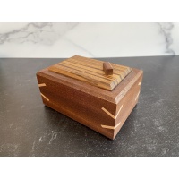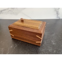 Blinded 2 by Dee Dixon. Description from Cubic Dissection: Blinded II is Dee's newest sequential discovery puzzle box. Crafted from sapele, zebrawood, and maple, with angled spline keys to reinforce the miter joints. Development required multiple prototypes, resulting in a refined and unpredictable puzzle.