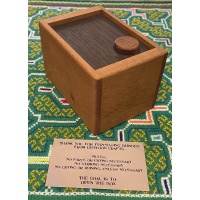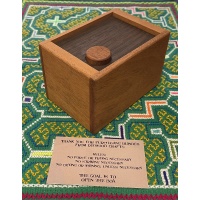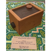 This is Blinded from Dedwood Crafts. This is a very fun puzzle with a pleasant and enjoyable solution. As with all of Dee's puzzles, it's also absolutely beautiful in its craftsmanship. I have carefully solved and reset this puzzle a few times, and the puzzle is in excellent condition.