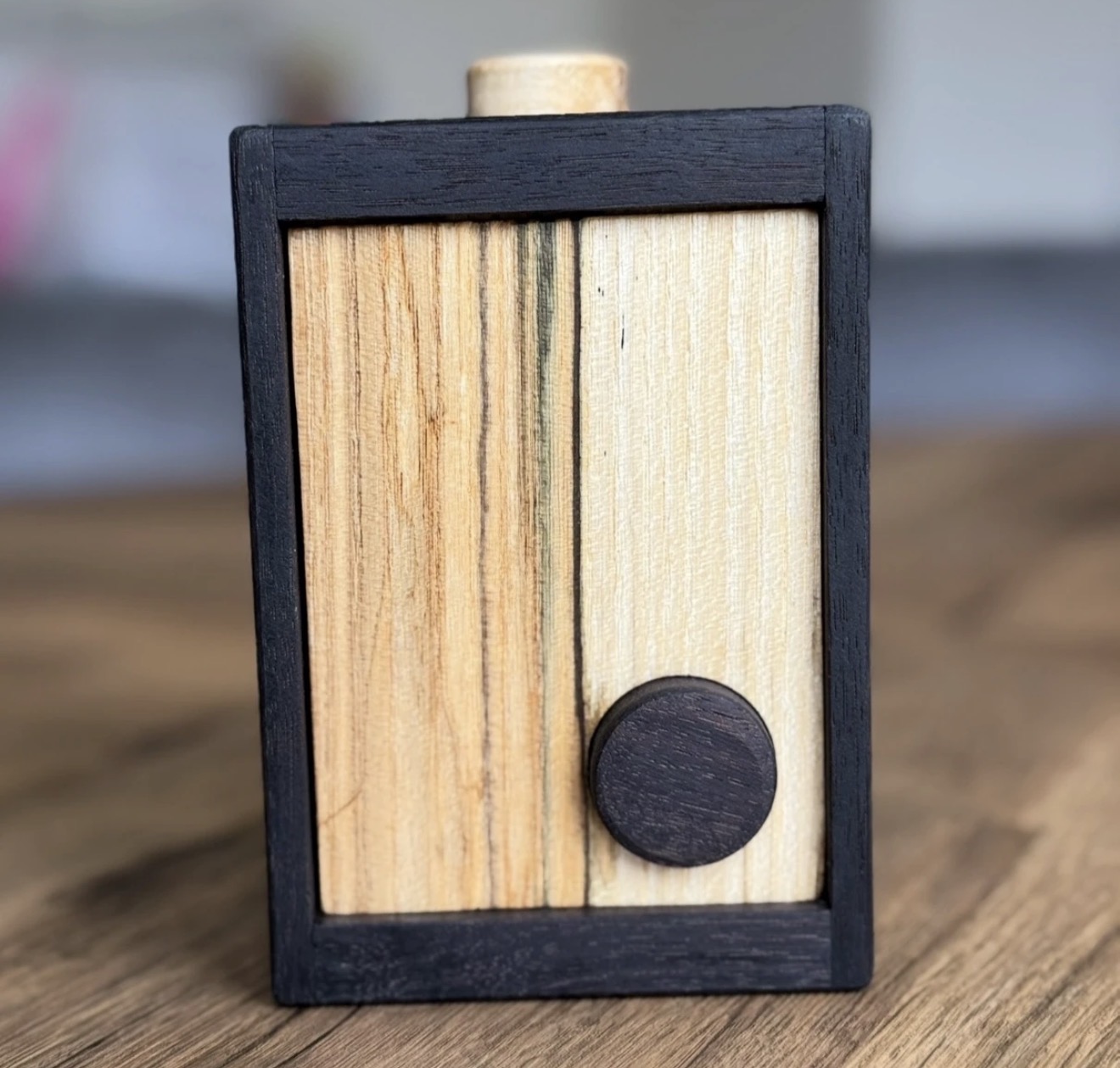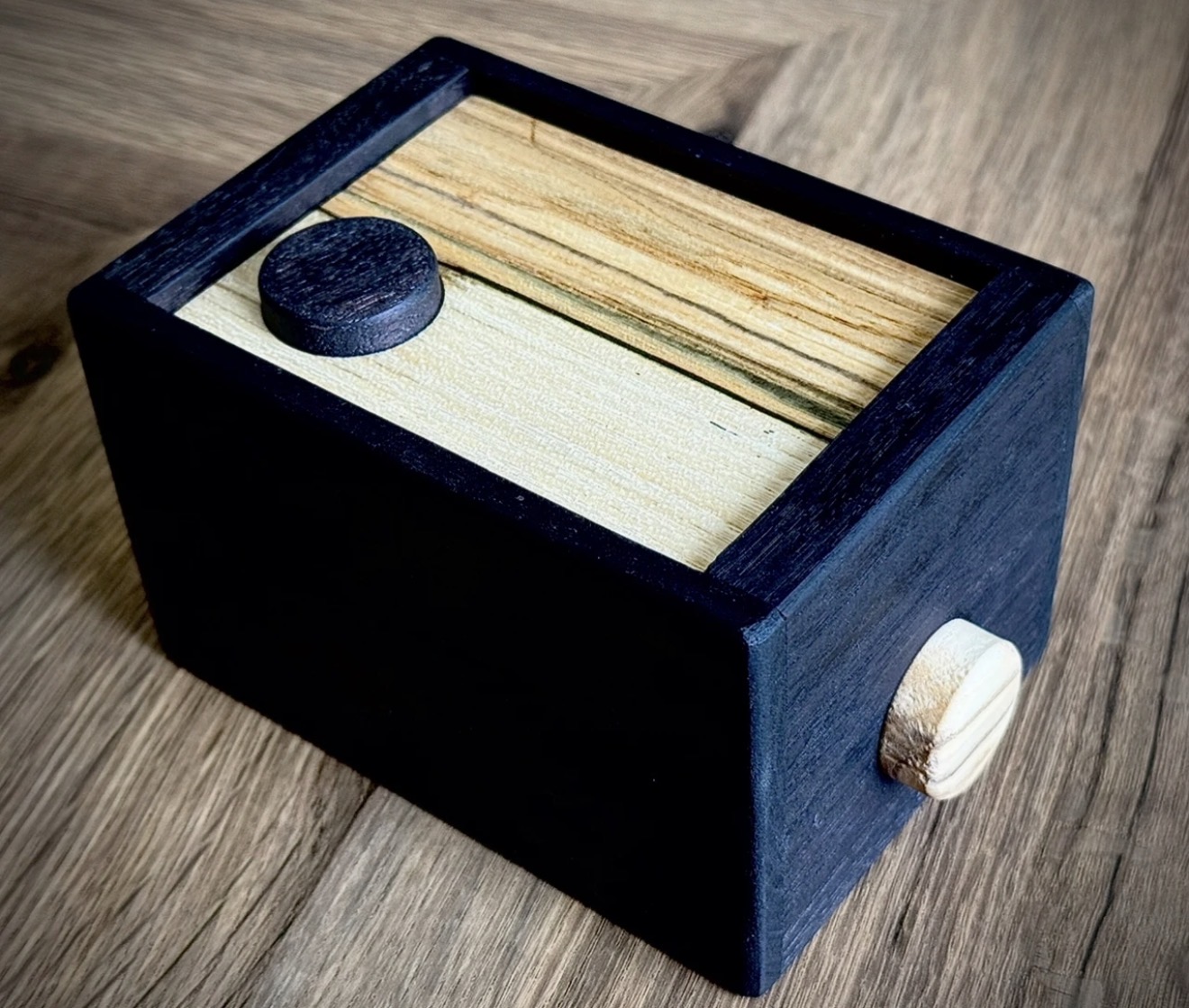 Here I have for sale a perfect edition of Blinded III - an amazing trick opening puzzle from the mind of Dee Dixon. This copy is made using Curly Maple and Purpleheart wood. See more details from the designer’s website below;Less blind than the darkness of Space and trickier than the Portal you traveled through to get there, Blinded III might get you lost and going in circles as you try to find your way free. More twisted and challenging than escaping the Spirit world, this puzzle box is des...