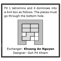 Objective: Fit 1 tetromino and 4 dominoes into a 4x4 box as follows. The pieces must go through the bottom hole.