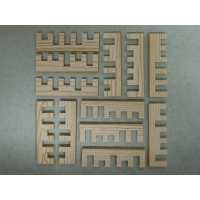 The puzzle consists of 6 pairs of wooden pieces. The goal is to arrange 5 of the pairs in a grid pattern, matching their  deep and shallow nothes. The information sheet describes various possibilities with the 12 pieces, and variations on the above mentioned main challenge.