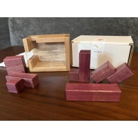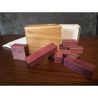 Our second release of Bonbon was constructed from the same Butternut we used previously. Butternut is usually a very soft wood, but we found an unusually dense billet with some nice figure and curl for this project. The pieces are made from Purpleheart, a dense hardwood. The fit and finish meet our accustomed accuracy, with parts sliding precisely and smoothly.