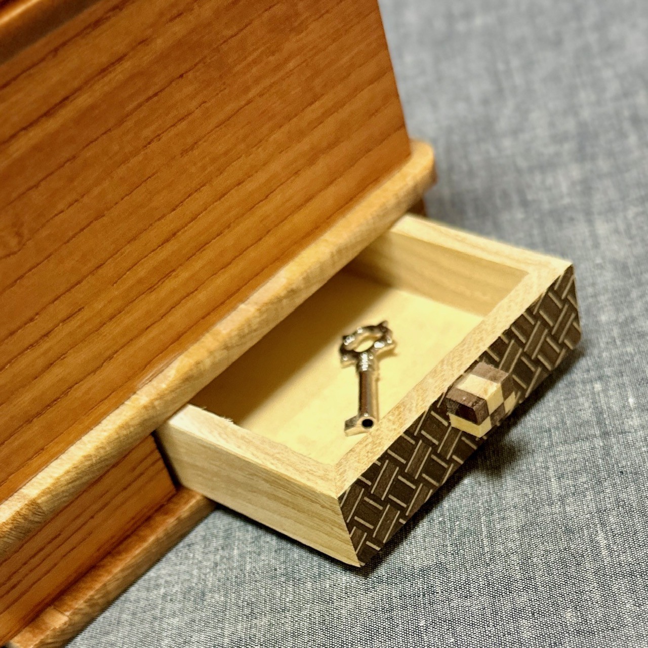 You can find small key inside. Also there is wood inlay(Zougan art) design on the back of the lid.