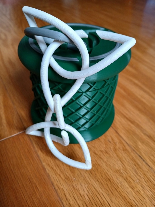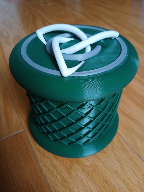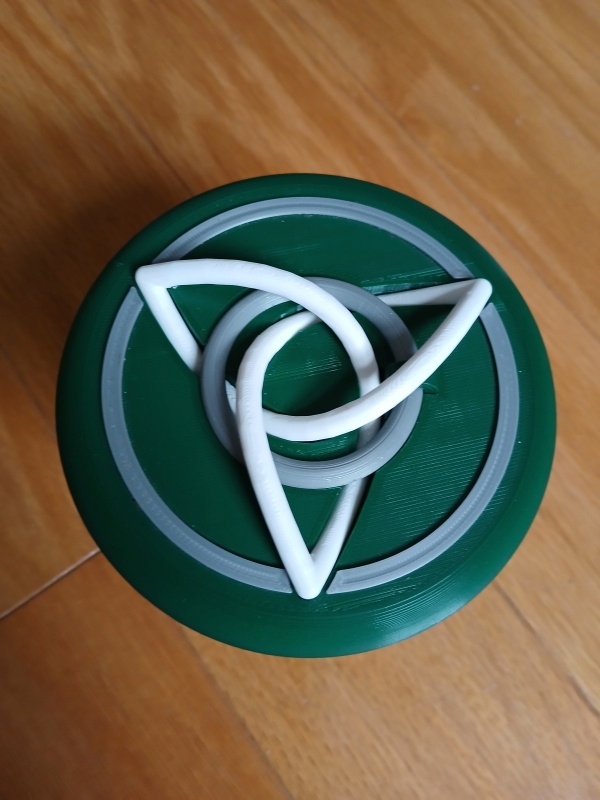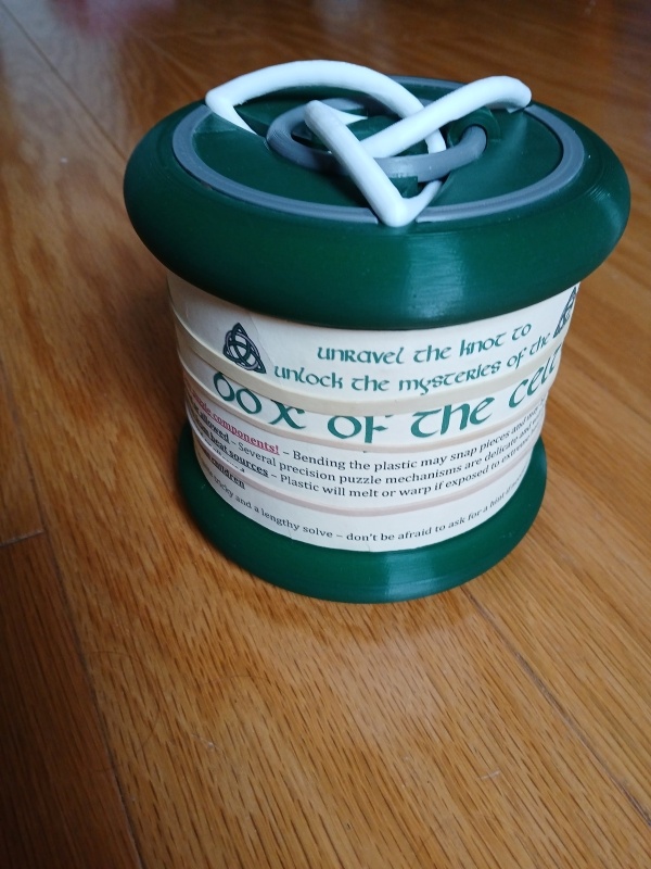 Furthermore, this is a very early copy of BotC (not a prototype!). Matt hasn't exactly changed anything about the solve of this puzzle, but looking at more recent copies of BotC, he's made some quality of life printing improvements such as a textured bottom instead of the flat bottom this one has. He also has included three QR codes as hints on the back of the paper instructions, but my copy of the instructions is completely blank when I look there. I used to have a blue rubber band holding the instructions in place, but it's snapped over the years of my ownership, so I've replaced it with 3 rubber-bands. Finally, I've had the white celtic knot snap on me, so Matt was kind enough to send me a new one as replacement. I kept the broken one and glued it back together, but it's just a spare that I'm including because it's nice to toy around with or give to a kid to have fun with. In the last picture, I try showing where the beige glue has discolored where the break was at the bottom, but it's not very clear with the camera.