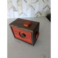 Boxed In is a puzzle box handcrafted from visually striking exotic woods by Dee Dixon of DEDwood Crafts. It combines multiple puzzle genres including sequential discovery. Begin by manipulating four knobs to open the lid—then more puzzling awaits. The design features mechanics not seen in Dee’s previous works. Numerous steps are required to solve the puzzle with several “aha” moments along the way. The puzzle measures 6.5 x 5.5 x 3 inches, which makes it one of the biggest puzzle boxes that Dee Dixon made.  Always looks small in the pictures but it is quite large.
