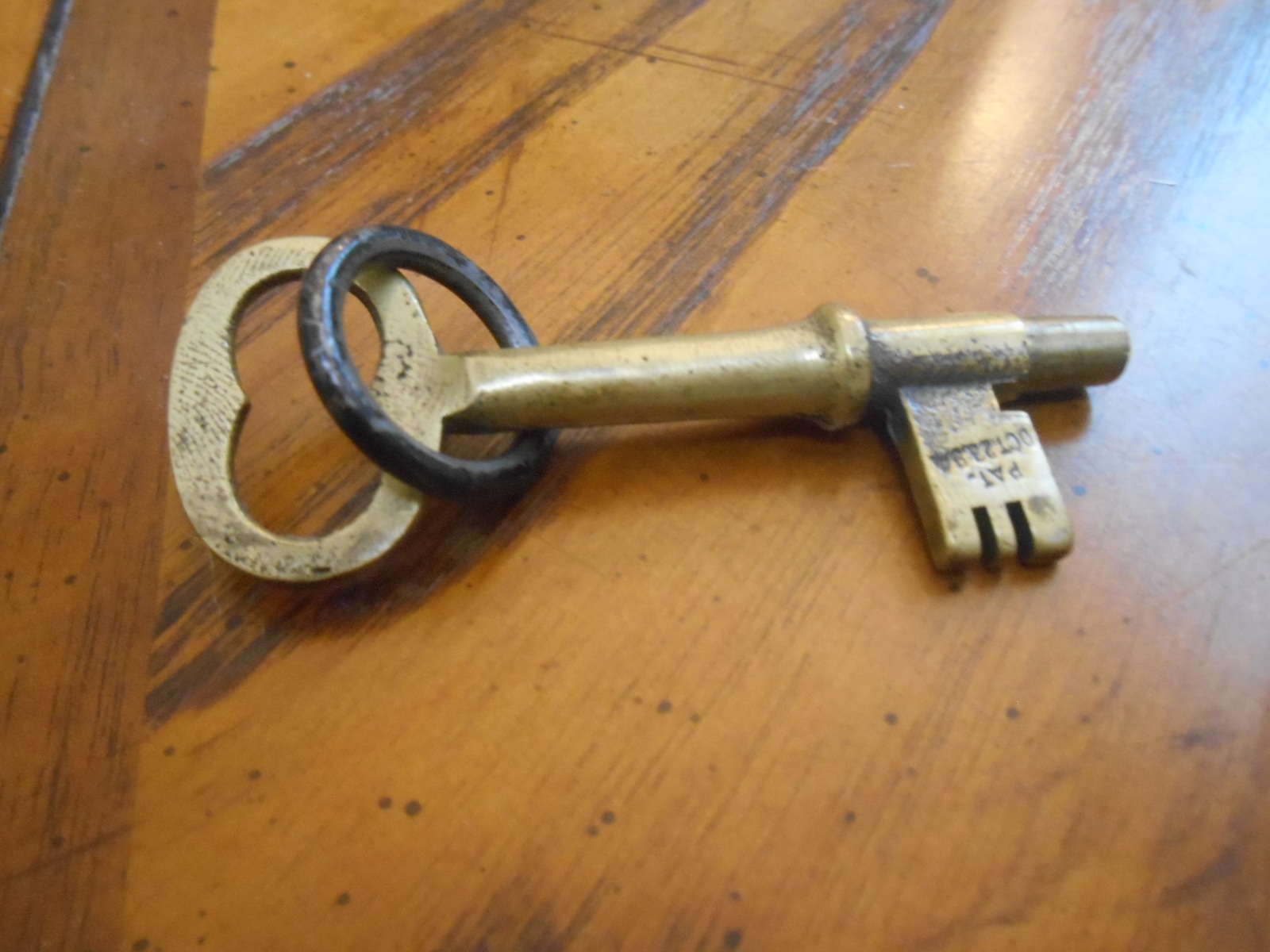 Key and Ring puzzle, brass. Stamp on the side that says Pat. Oct.23.94, which I assume means 1894. I couldn’t find it on the US Patent Search website. Simple puzzle, reproduced many times in slightly variant shapes.