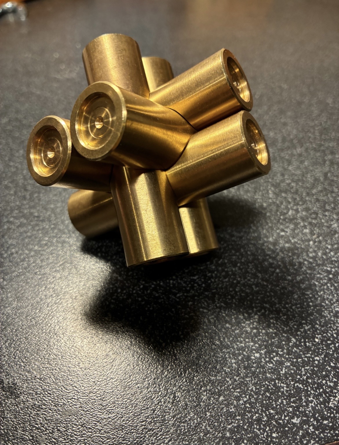 Brass Monkey 2~~By 2 Brass Monkeys. A six piece burr puzzle. Solid brass, weighs over 1 pound. Each piece is 70mm  long with a diameter of 19mm. It’s precision, and well made, and heavy. Shipping in U.S.A. Only. Buyer pays for shipping. Please wait to send payment until shipping cost is determined.