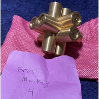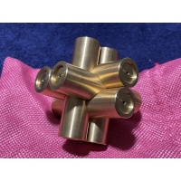 Brass Monkey Four. Just a single hole at the end of each piece differentiate it from Brass Monkey One, Two and Three. The absence of a single ring differentiates from Brass Monkey Five. Like the previous puzzles it weighs almost 800g (1.1 lbs). Each piece is 70mm long and has a diameter of 19mm. This is a puzzler's puzzle. Perfect for fooling those who think they have seen it before. It looks like a standard interlocking Burr. It isn't.