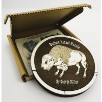 The Buffalo Nickel Puzzle is based on the Nine-and-a-half Moves puzzle by Oskar van Deventer. It is composed of just three pieces that fit together in such a way as to hide a secret compartment and find the Nickel. Although the three pieces are flat and lie in a single plane, it takes a remarkable 9 ½ moves to solve.