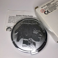 The Buffalo Nickel Puzzle is based on the Nine-and-a-half-Moves puzzle by Oskar van Deventer. It is composed of just three pieces that fit together and also a hides a secret compartment with the original prize included. Although the three pieces are flat and lie in a single plane, it takes a remarkable 9 1/2 moves to solve.