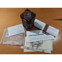 This copy has been solved and carefully reset once, and is ready for the next puzzler to enjoy it. The stand was optional when I bought the puzzle, and is included here. All the paperwork will also be provided as well as some spare parts (which I never needed and are still in a sealed envelope like I received them).