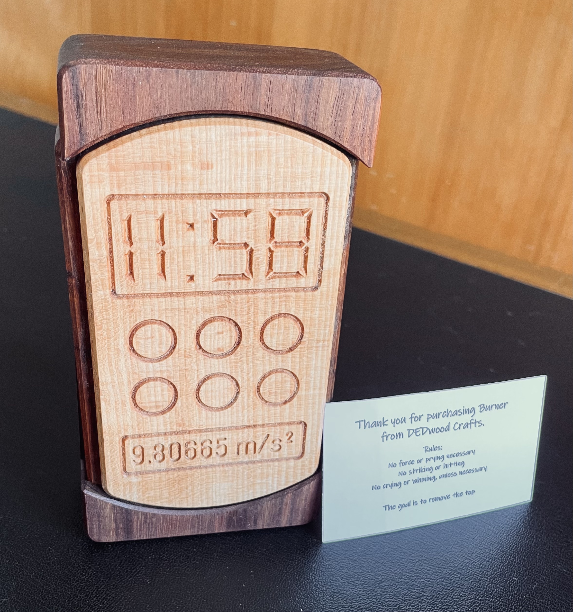 Burner resembles a modern cell phone and should provide a bit of a challenge. The goal is to remove the center portion. Once solved, the inner mechanisms will be revealed. This multi-step puzzle is part sequential discovery and part trick opening. It is made from beautiful granadillo and contrasting European beech. Its dimensions are 6" x 3" x 1.5".