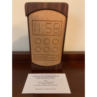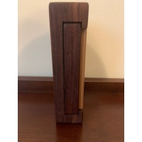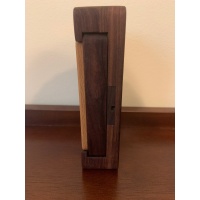 It resembles a modern cell phone and should provide a bit of a challenge. The goal is to remove the center portion. Once solved, the inner mechanisms will be revealed. This multi-step puzzle is part sequential discovery and part trick opening. It is made from beautiful granadillo and contrasting European beech. Its dimensions are 6" x 3" x 1.5".
