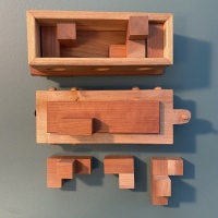 CABOOSE is the first in perennial IPP Puzzle Exchange participant Henry Strout's series of train car-themed packing puzzles.  Very nicely crafted, engraved, and finished by Henry in a variety of contrasting woods.  The goal of the puzzle, of course, is to pack the pieces into the body of the train car and then to fit the bottom of the train car (which has a fixed piece on it!) flat onto the bottom of the body.