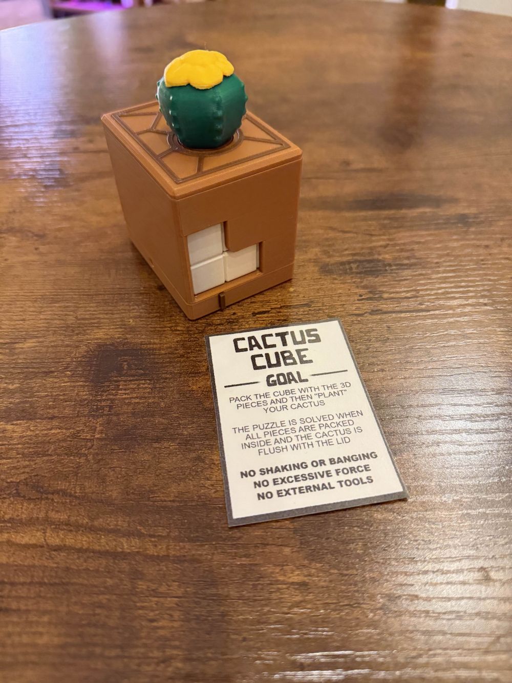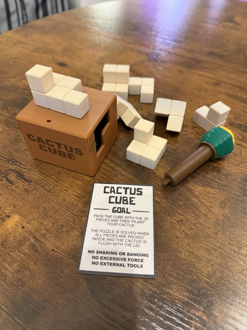 The goal is to pack the pieces into the box and plant your cactus! There is a mechanism to discover to allow you to plant the cactus. My 2021 version had two packing solutions. This version has been slightly modified to only allow one packing solution.