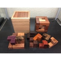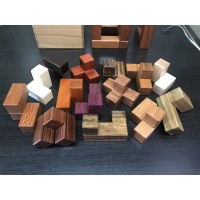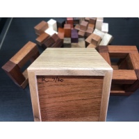 Material: Jatoba (Cage), Mahogany (Jig), Butternut/ Jatoba (Box), Padauk, Maple, Granadillo, Wenge, Purpleheart, Bubinga, Leopardwood, Bocote, Chakta Viga, Holly, Schedua, Cherry, Black Limba, and Goncalo Alves (Pieces).