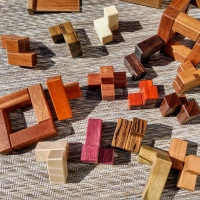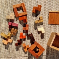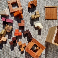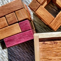 | MATERIAL: | Jatoba (Cage), Mahogany (Jig), Butternut/ Jatoba (Box), Padauk, Maple, Granadillo, Wenge, Purpleheart, Bubinga, Leopardwood, Bocote, Chakta Viga, Holly, Schedua, Cherry, Black Limba, and Goncalo Alves (Pieces) |